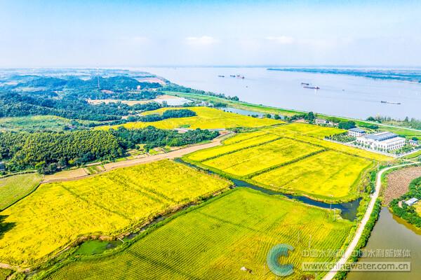 金秋时节,在长江沿岸的安徽省芜湖市繁昌区,大片水稻田迎来丰收。连片的稻田和繁忙的长江主航道构成一幅美丽的江畔秋收图景。