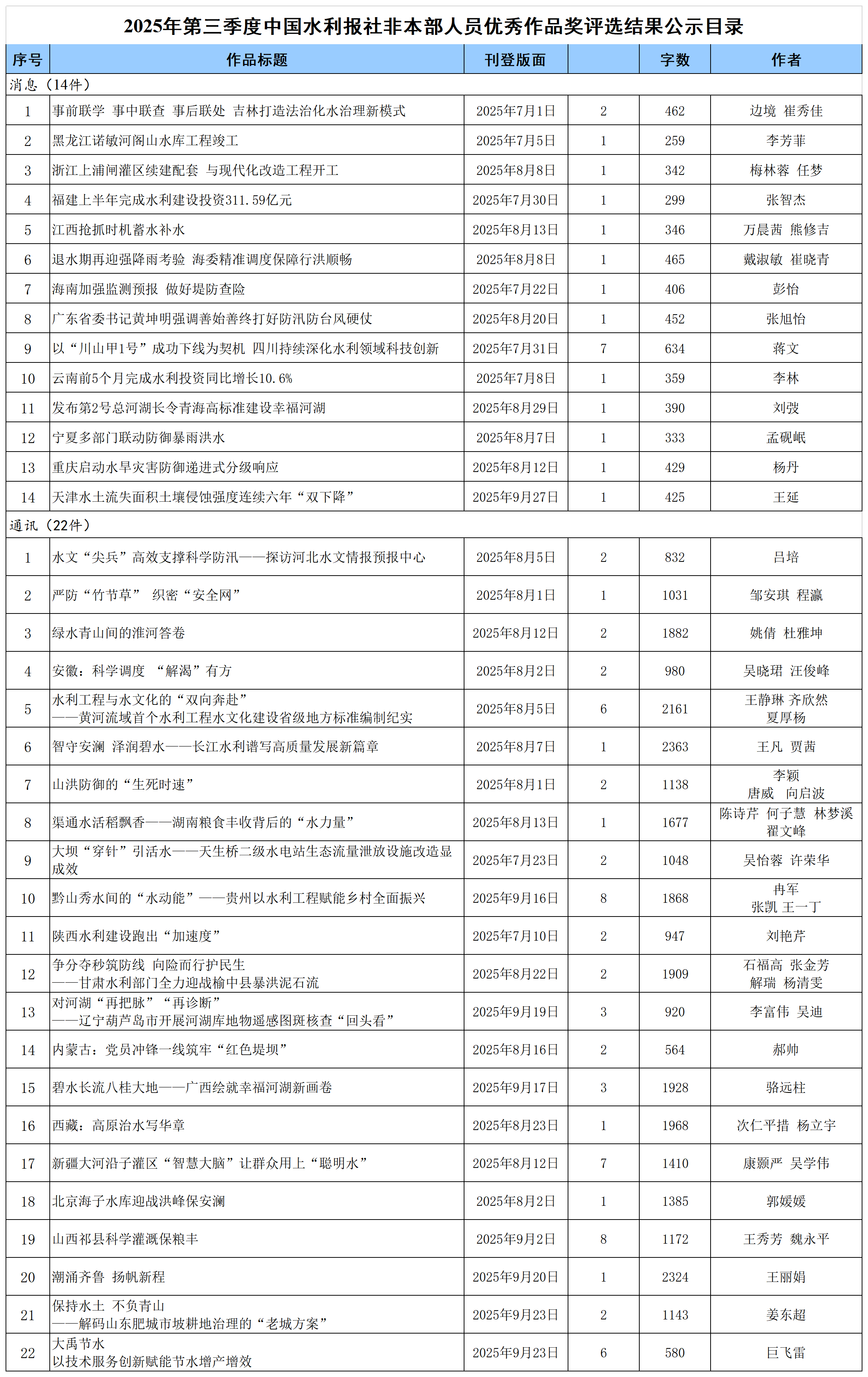 根据《中国水利报社非本部人员优秀作品奖评选奖励办法》要求,中国水利报社2025年第三季度非本部人员优秀作品奖评选工作已完成。经过评委投票,共评选出消息14件,通讯22件。现对评选结果进行公示,公示日期为2025年12月12日至2025年12月18日,公示期间,如有问题,请向记者读者部反映。