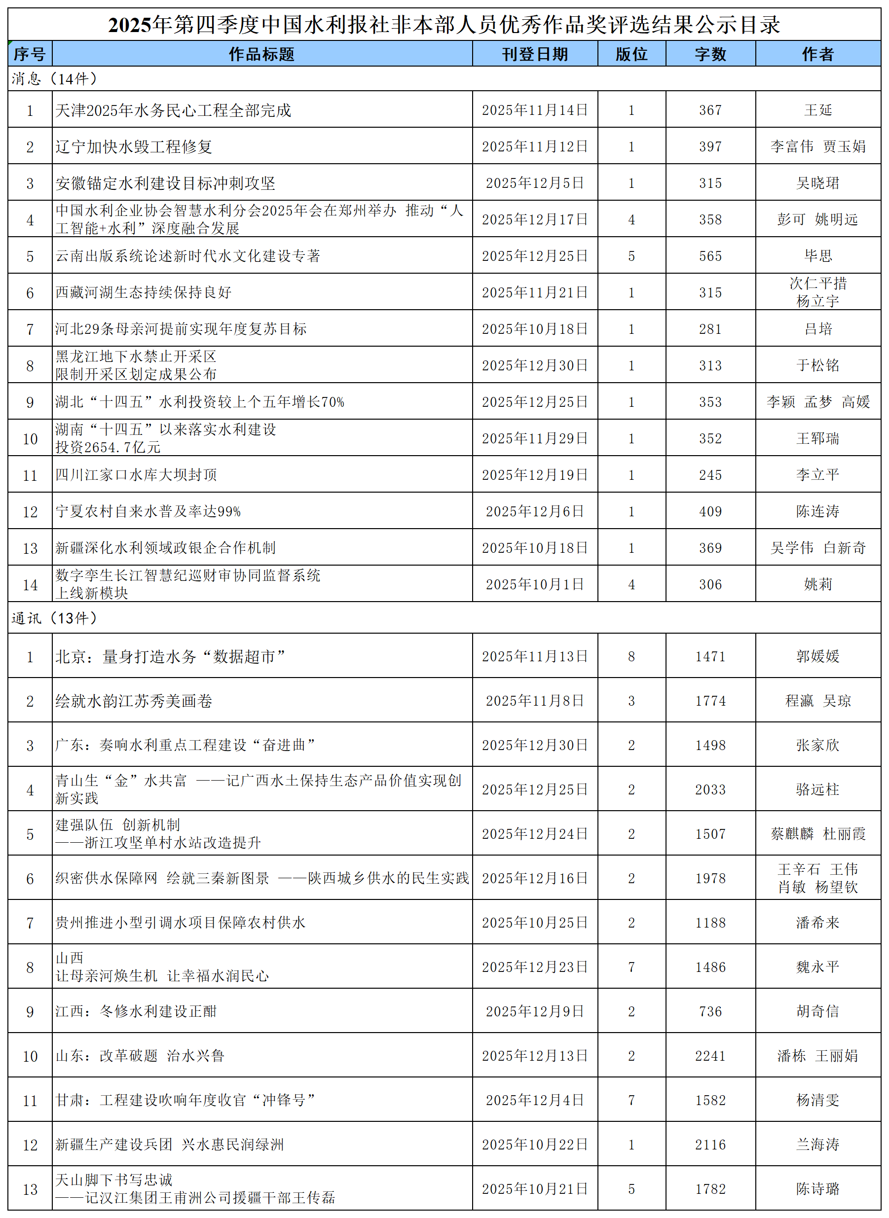 根据《中国水利报社非本部人员优秀作品奖评选奖励办法》要求,中国水利报社2025年第四季度非本部人员优秀作品奖评选工作已完成。经过评委投票,共评选出消息14件、通讯13件。现对评选结果进行公示,公示日期为2026年2月3日至2026年2月9日,公示期间,如有问题,请向记者读者部反映。