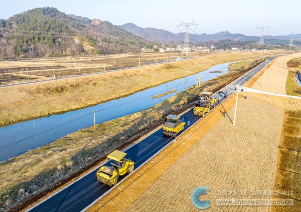 图为日前在繁昌区孙村镇境内的黄浒河上游整治工程工地上,施工人员进行防汛道路沥青摊铺作业。