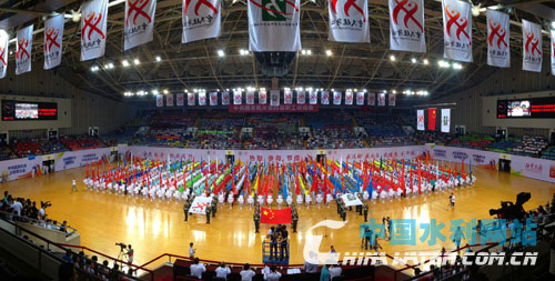 入场式上,水利部职工运动员代表组成的方阵,迈着整齐矫健的步伐,手中挥舞着蓝色旗子,英姿飒爽,体现了水利人以拼搏精神践行新时期治水思路,着力构建中国水安全保障体系的时代风貌。当他们经过观众区时,部直属机关干部职工纷纷起身,齐声高呼“发展水利,改善民生”,激昂的欢呼声顿时感染了现场的观众。